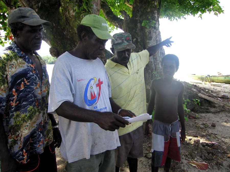Thomas identifies the coelacanth from the sheet, and then from the picture of the Comoran coelacanth catch ...A Solomon fishing dugout. (Coelacanth photo courtesy Said Ahamada. All other photos by the author)